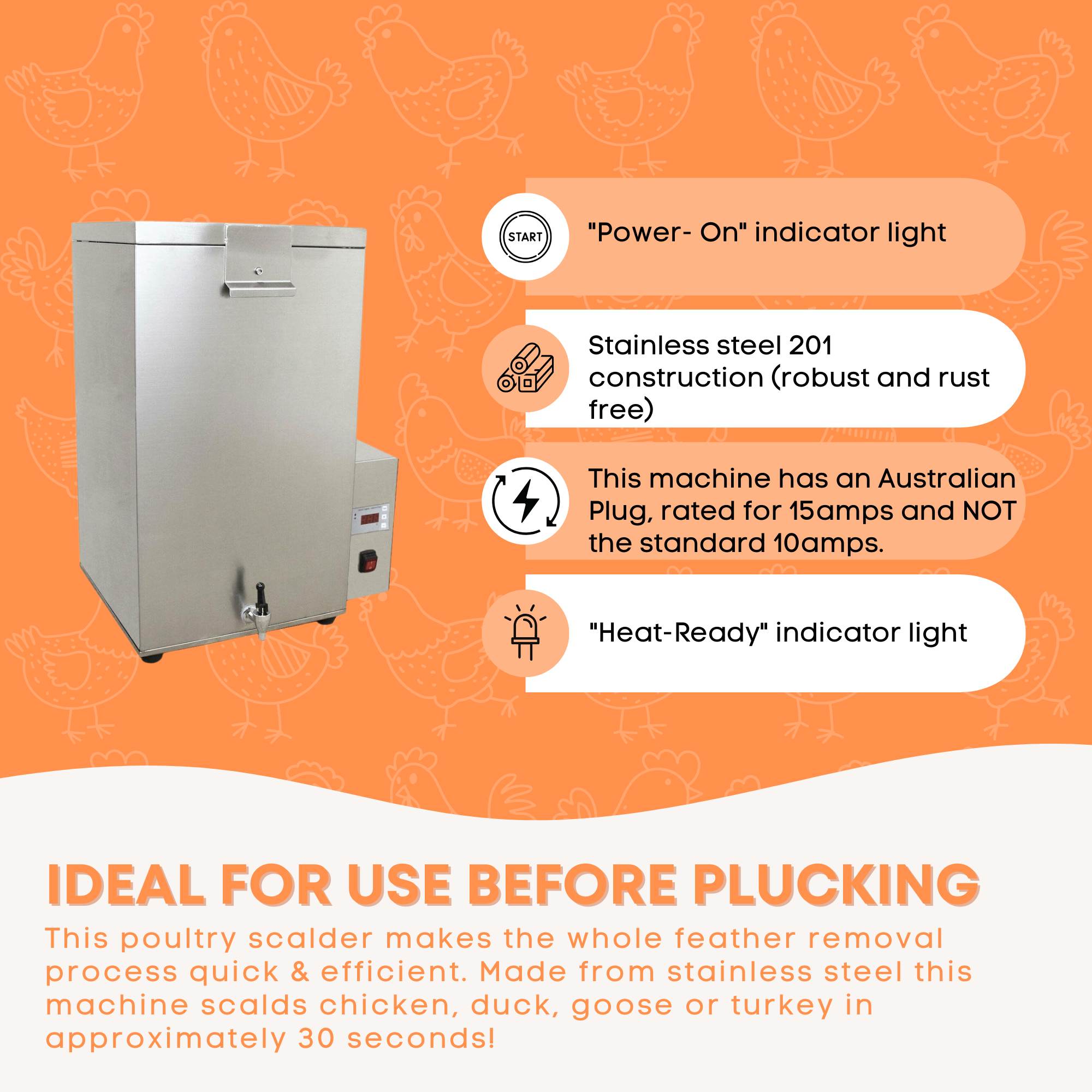 Ideal for use before plucking, this poultry scalder makes the whole feather removal process quick & efficient. Made from stainless steel this machine scalds chicken, duck, goose or turkey in approximately 30 seconds!