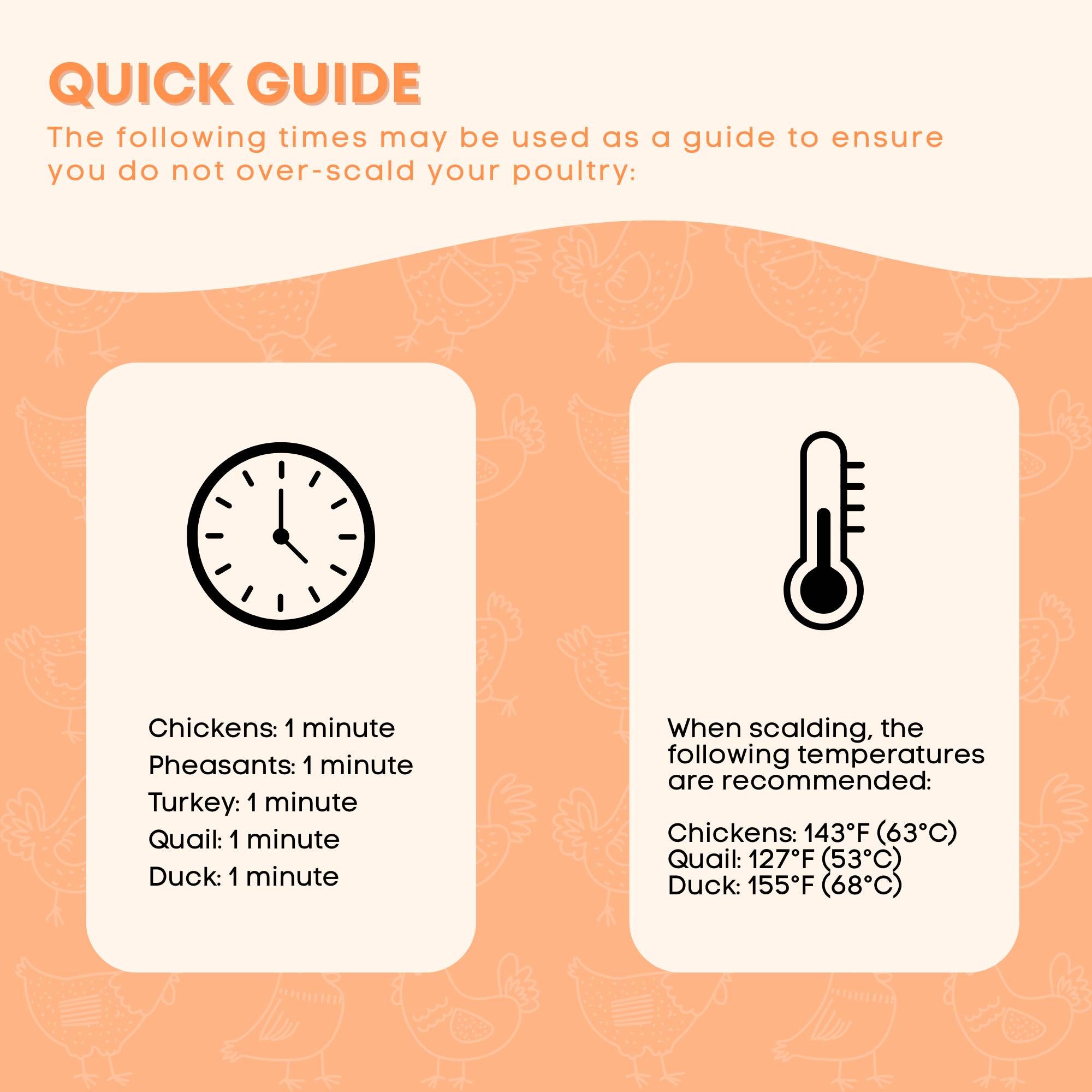 The following times may be used as a guide to ensure you do not over-scald your poultry: