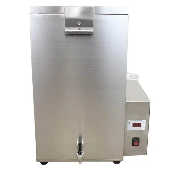 70 Litre Stainless Steel Poultry Scalder with drain basket, tap, thermostat and display screen for temperature control.