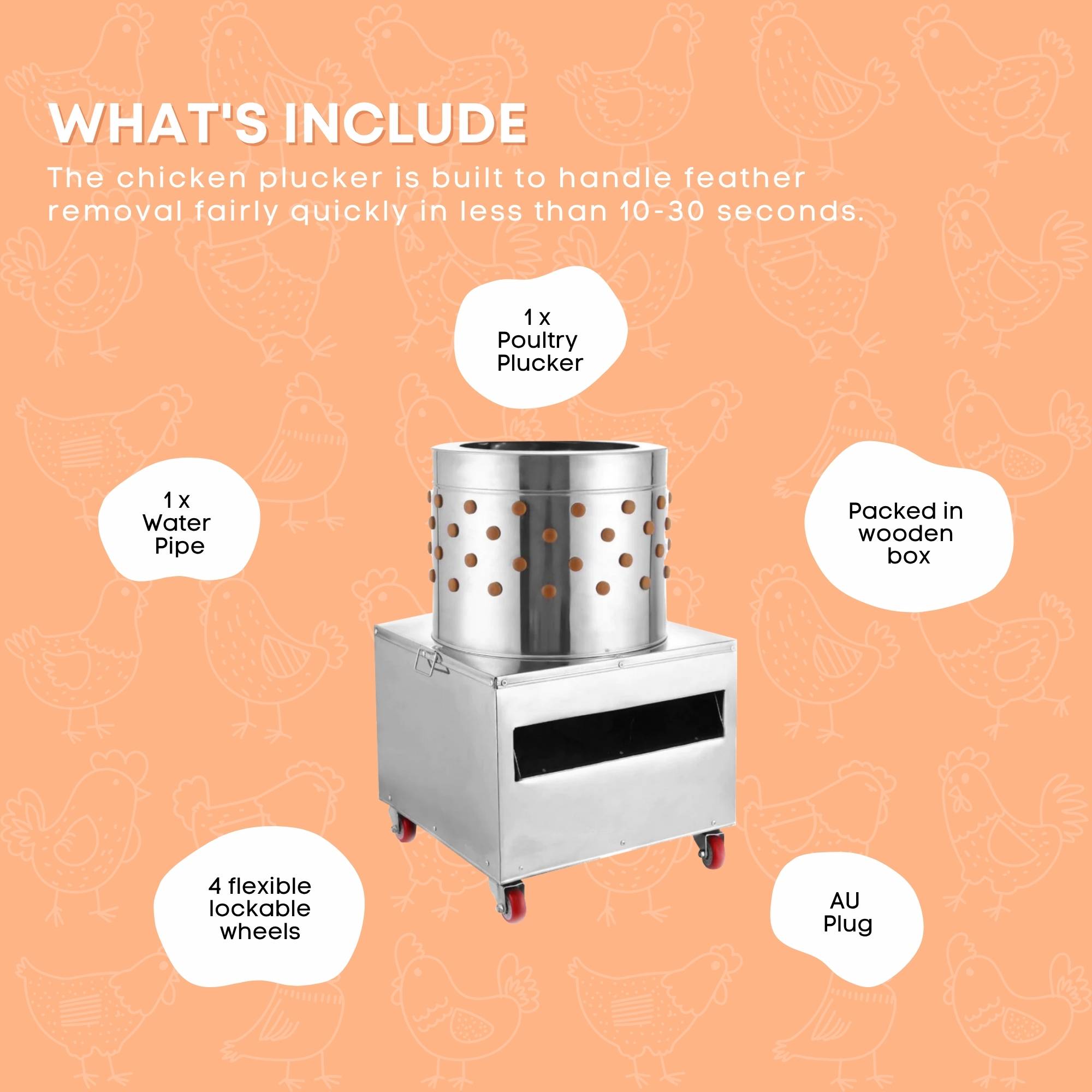 This efficient plucker is designed with four wheels for effortless mobility. With a garden hose attachment and a quick start-up, you can have freshly plucked chickens in under sixty seconds.