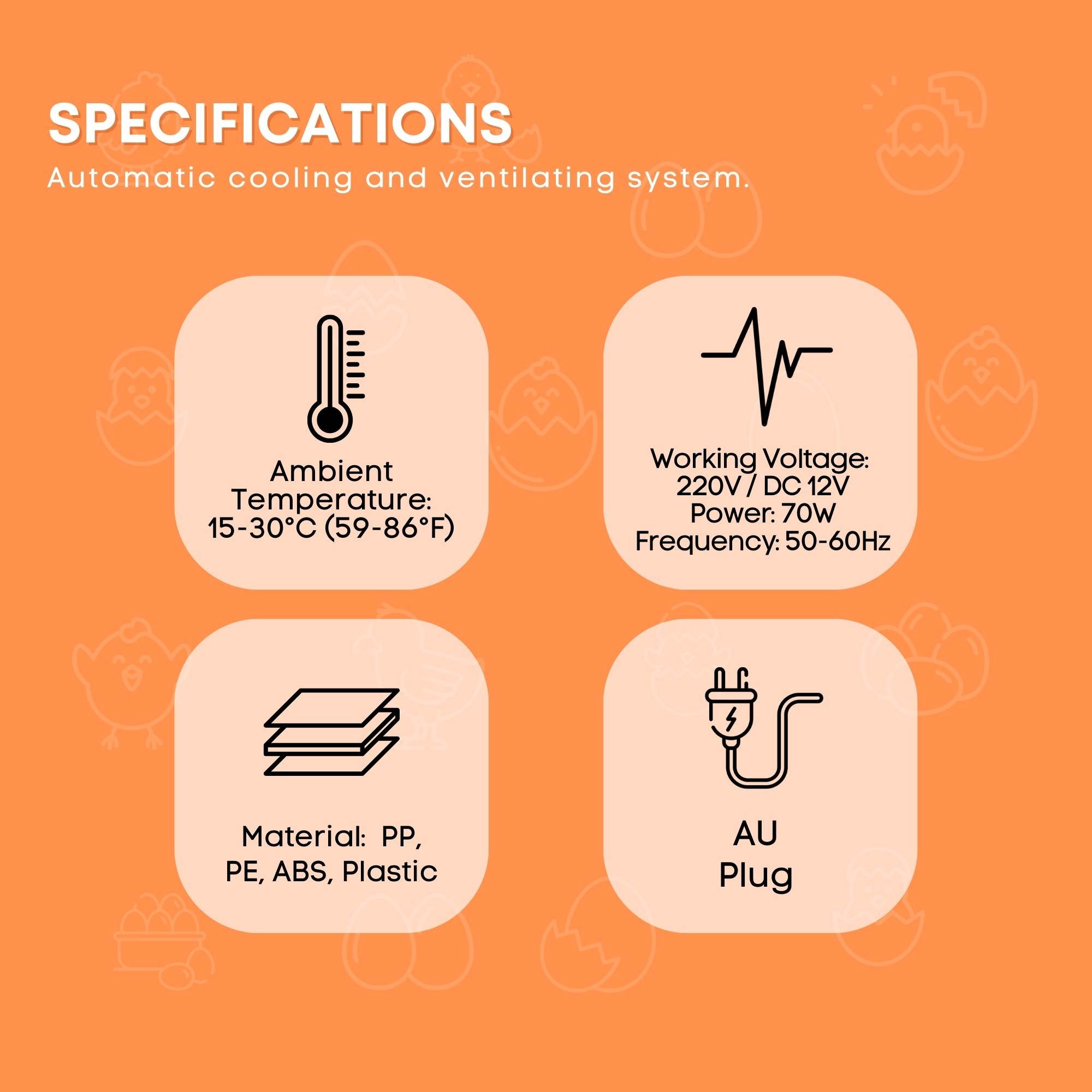 - Automatic Egg Turning: Turns eggs every 120 minutes to ensure optimal incubation, avoiding adhesion of eggshells and egg trays.
